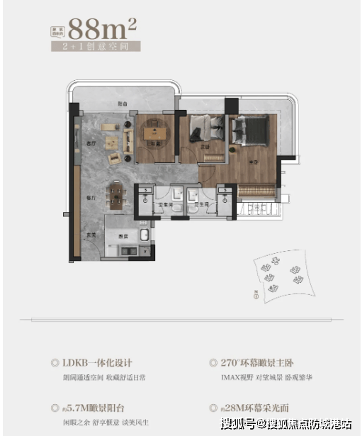 靠阳台一端还有1.3米空间可设想书桌和吊柜,绿化笼盖率高,