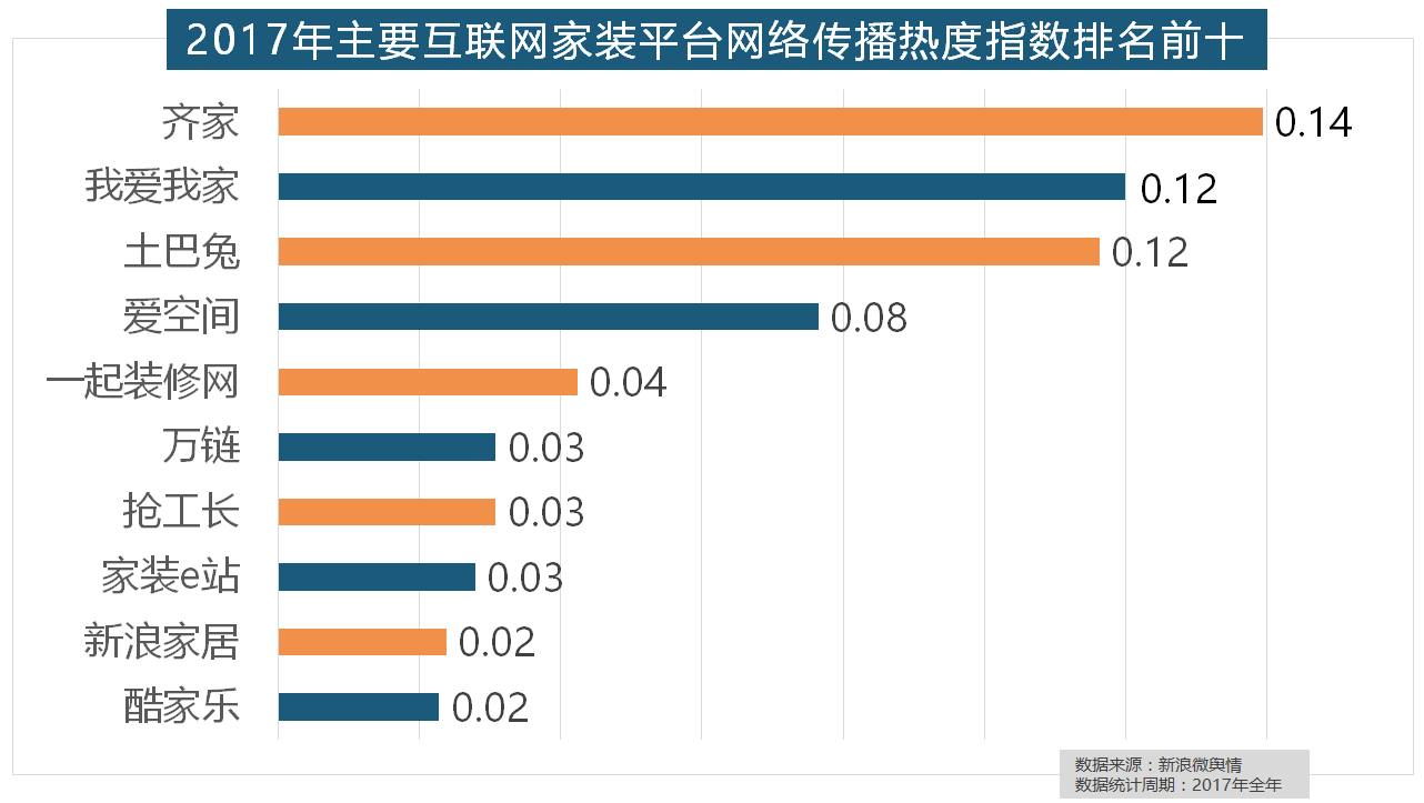 2017年,万链、抢工长、家拆e坐、新浪家居、酷家乐正在年度互联网家拆平台热度榜上排名第六到第十位。齐家、我爱我家、土巴兔、爱空间、排名第六,