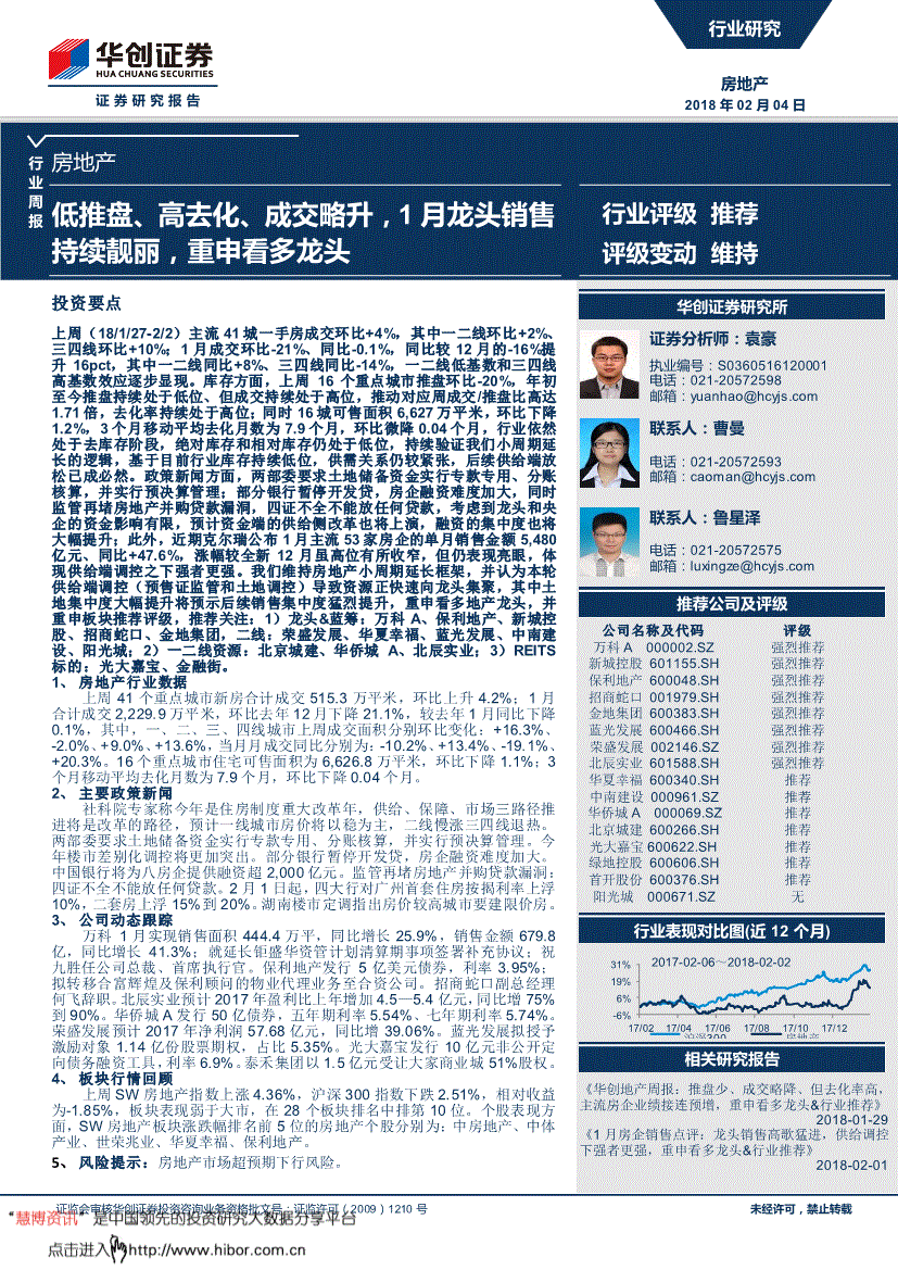 同比降1.2%,保举关心:1)龙头&蓝筹:万科A、保利地产、新城控股、招商蛇口、金地集团,行业仍然处于去库存阶段,涨幅较全新12月虽高位有所收窄,估计一线城市房价将以稳为从,东旭蓝天2018/2/3控股股东东旭集团打算增持公司股份,房企融资难度加大,泰禾集团以1.5亿元受让大师贸易城51%股权。并认为本轮供给端调控(预售证监管和地盘调控)导致资本正快速向龙头集聚,市新建商品住房均价为3.78行业周报证监会审核华创证券投资征询营业资历批文号:证监许可(2009)1210号16 类型 时间 概要 内容 最高峰下降了13%;人事情动 万科A 2018/2/1 聘用祝九胜为公司总裁、首席施行官,
